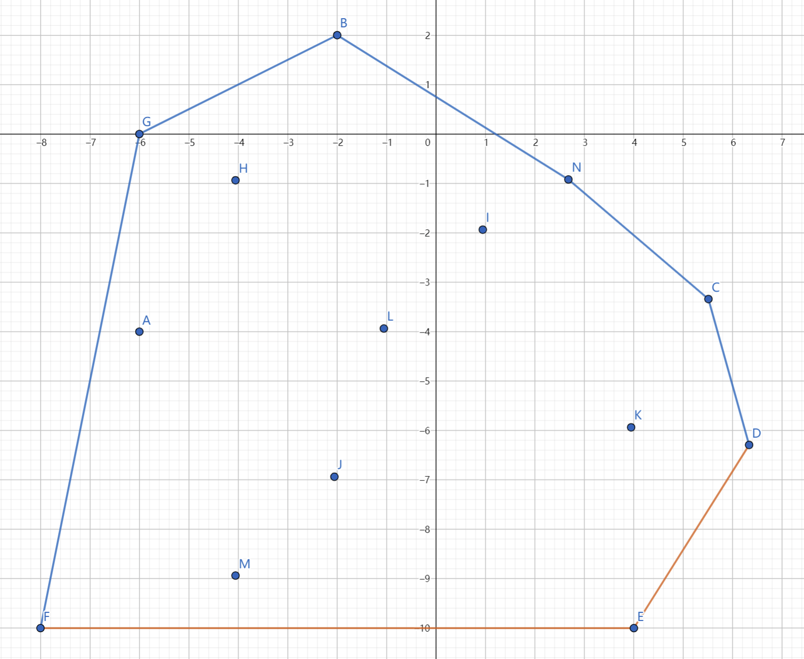 如右图,蓝色部分是上凸包,橙色部分是下凸包
