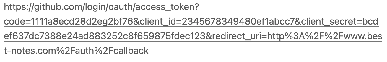 code—— 这就是 Authorization code 的值client_id—— 跟前面一样,这个 client_id 可以帮助 GitHub Authorization Server 识别第三方应用的(在本文中就是 Best-Notes)client_secret—— 这是一个密码,在注册 Application 的时候,GitHub 会生成这个字符串,用于 GitHub Authorization Server 验证 Application 后端的身份 —— 什么意思呢?还记得第三步中,用户跳转到 GitHub 授权页面时,client_id 其实是暴露在浏览器地址栏中的,因此任何人(包括黑客)都能看到这个 client_id,因此如果只是使用 client_id 做验证是不安全的。—— 简言之,client_id 和 client_secret 在这一步中用于向 GitHub Authorization Server 证明这个请求真的是来自 Application(的后端)redirect_uri—— 这个值必须跟前面的一样,否则也会被 GitHub Authorization Server 拒绝。个人认为,这个参数在这边存在的意义是比较小的,毕竟根据 client_id 和 client_secret 就已经能验证 Application 的身份了,根据官方文档,这个参数只是为了多加一层安全保护。